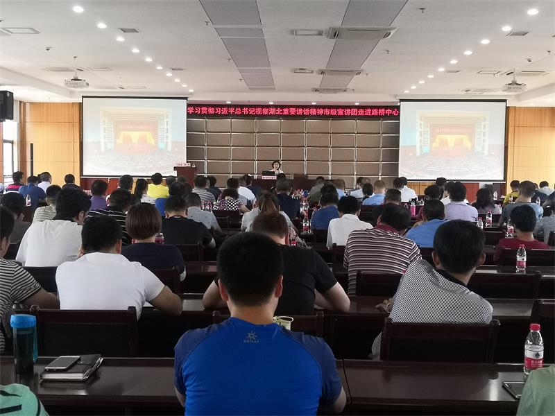 2018年6月6日下午,市路桥中心(城市运营公司)举办学习贯彻习近平总书记视察湖北重要讲话精神市级宣讲团走进路桥中心专题学习辅导报告会,特邀湖北省委宣讲团专家成员、中南财经政法大学经济学院博士生导师朱巧玲教授作专题辅导。市城投集团公司党委委员、董事邓耀光同志,市路桥中心(城市运营公司)领导班子成员,全体中层干部,二级单位办公室主任,三级单位正副职,机关全体党员,2017年发展的预备党员和2018年发展对象约170人参加了学习。报告会由路桥中心党委副书记、纪委书记熊燕同志主持。