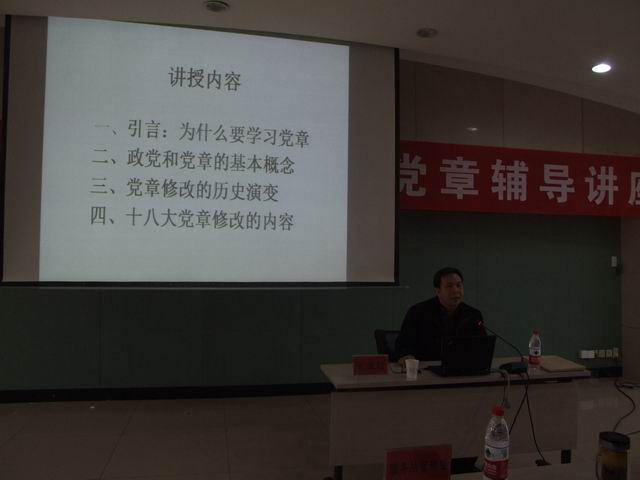 讲座中,王校长用丰富的理论、精辟的语言,围绕“自觉学习党章,加强党性修养”这一主题,联系实际深入浅出地阐述地广大党员干部为什么要学习党章、党章的基本内容及党章修改的历史,并对十八大对党章的修改内容进行了逐条对比解析。学习人员用心聆听,专心笔记。讲座结束后,组织了学习新党章和时事政治答题活动。