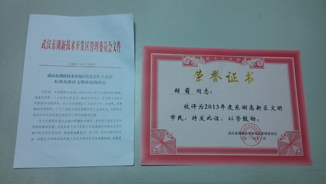 12月2日,从东湖高新区管委会传来喜讯,在武汉市东湖高新区文明市民评选活动中,王家店服务站职工胡萌同志荣获“文明市民”称号,这是该站文明创建工作的又一成果。