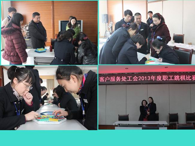 12月26日下午,客户服务处工会在中心608会议室举办了2013年度职工跳棋比赛,40余名职工参加了活动。中心工会主席赵凯、副主任黄文红莅临现场观摩了比赛。