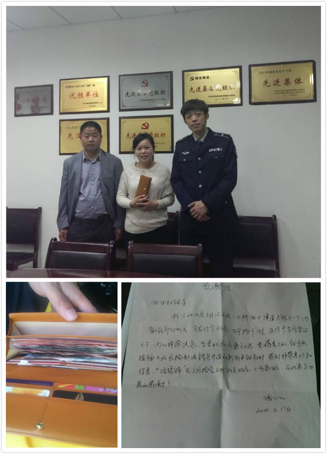 3月15日周六上午,路桥中心稽查四中队稽查队员胡晓钢,在二七长江大桥稽查执法时,发现桥面上遗落一个黄色钱包,他上前一看包里有1500元现金、银行卡3张、购物卡、医保卡等重要证件。由于担心失主为不慎丢失财物紧张焦虑,胡晓钢根据包内查找到的线索想方设法与失主辗转取得了联系。3月17日上午,失主潘女士与丈夫一起来到稽查四中队,通过与潘女士所随身携带证件与包内物件进行仔细核对后,稽查队员胡晓钢将钱包归还给她。潘女士怀着激动的心情握着胡晓钢的手连声道谢,对稽查队员们的拾金不昧行为深表感谢。