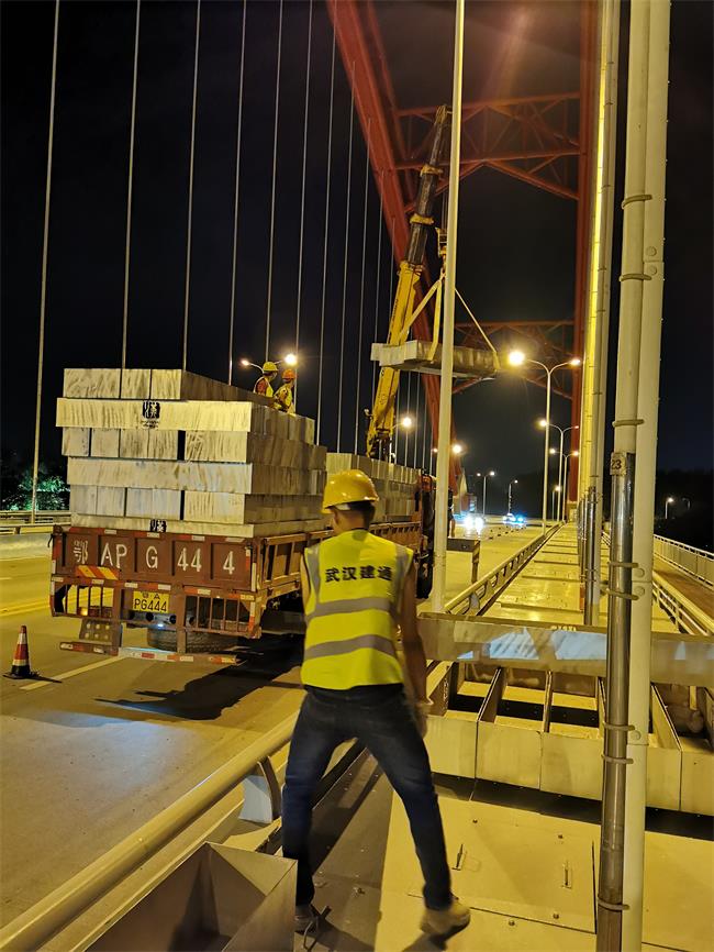 在晴川桥绿化项目施工中,为最大限度减少施工对交通的影响,建通公司项目人员连续多日“熬夜工作”,从晚上10点到凌晨3点,将400多个不锈钢关键构件吊放在桥面指定位置,整齐有序地摆放至桥面人行道两侧,为下一时间节点绿化种植花草提供重要保障。
