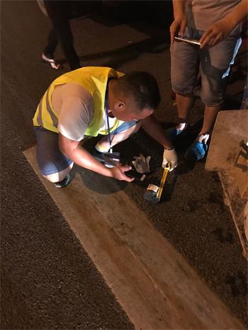 2019年7月20日凌晨检测员刘敬军在二环线(姑嫂树路~知音桥)整治提升工程道路上监督抽检钻芯取样。