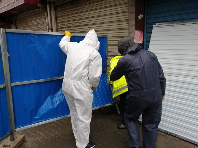 在梅隐寺社区,队员吴曼莉、李锋随社区网格员查看辖区路段,对大风吹倒的围栏挡板进行恢复