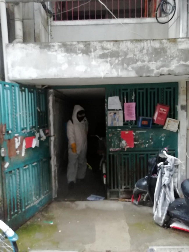 在水陆社区,队员毛政权、鲁敏进行喷洒消毒作业近5000平方米