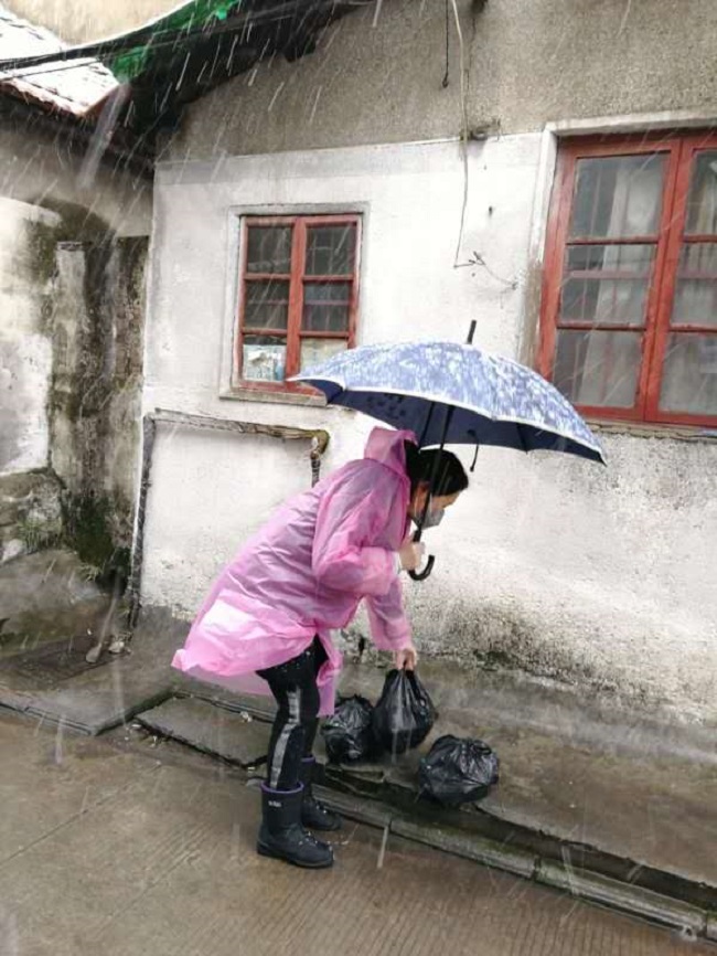 在解放路社区,队员朱正凯、秦艺敏冒雨测量过往人员体温