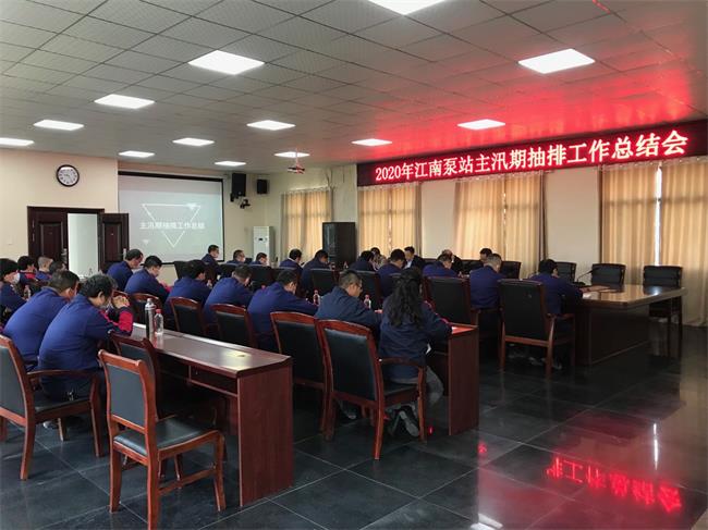 会上,江南泵站分公司负责人汇报了江南泵站2020年主汛期抽排工作情况,泵站运行组和维修组的2名骨干,代表泵站全体职工汇报了主汛期不舍昼夜备勤抽排的工作体会。