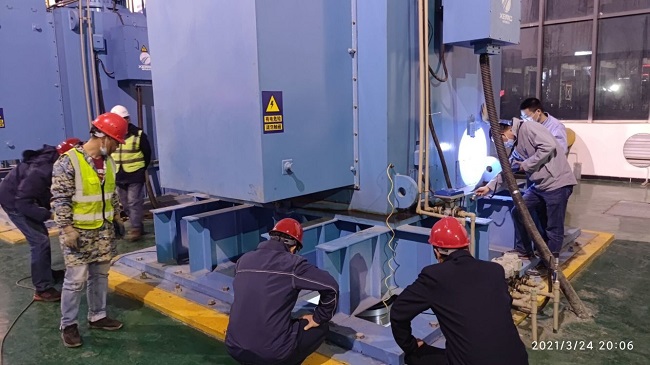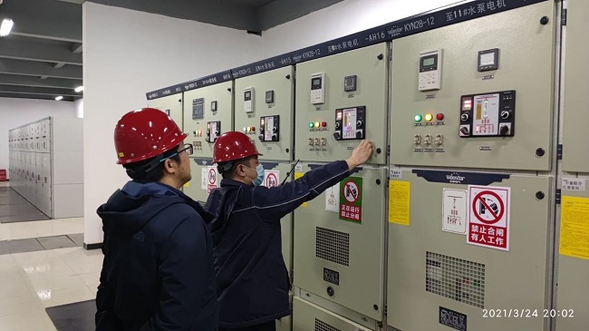 “3,2,1,启动”“请监控室报告泵机运行的电流、电压、功率因数情况……”随着现场一声声调度指令的下达,江南泵站7#、10#、13#、14#等四台维保水泵机组的试运行工作正在紧张有序地进行着,这也是自2020年11月进入自排期后,沉寂的泵房车间再次响起强劲有力的泵机轰鸣声。此时已是3月24日深夜,但泵站依然灯火通明,在维保机组试运行现场,施工、厂家、监理等单位的专业技术人员及泵站负责人、生产调度、技术维修及运行人员紧密协调配合,严格按照既定的试运行操作规程和计划安排,严密查看测量维保机组的试运行工况,分析比较机组维保前后各项运行参数指标,确保机组性能专业测试、数据详实。当晚各机组在规定的试运行时效内各监控参数表现良好,泵机主机、辅机设备等整体运行状况正常,四台维保机组一次试车成功,达到了水泵机组维保的预期目标,标志着江南泵站自投入运行四年来首次顺利完成水泵机组维保工作任务。