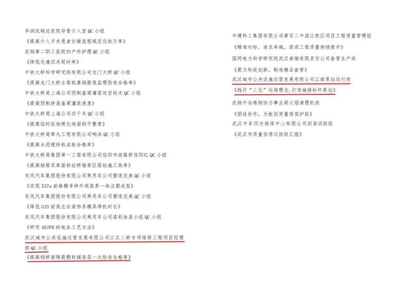 2022年9月8日,从武汉质量与认证认可协会传来了两份捷报,城运公司江南泵站运行班《践行“三化”运维理念 ,打造城排标杆泵站》荣获了“2022年度武汉市质量信得过班组建设经验交流二类成果奖”,江汉二桥专项维修工程项目经理部 QC小组《提高钢桥面陶瓷颗粒铺装层一次验收合格率》荣获了“2022 年度武汉市质量管理小组优秀成果”奖。