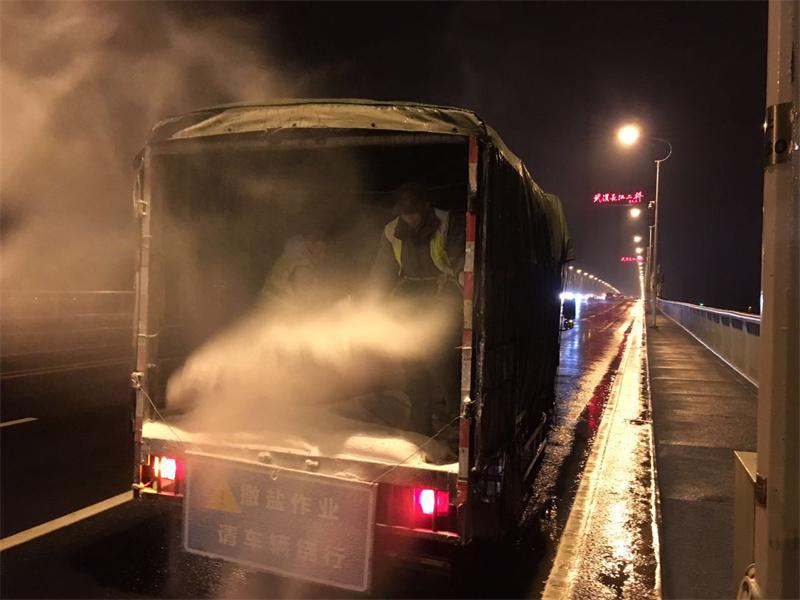 2月7日夜,武汉迎来2017年初雪,市民欢喜着欣赏纷纷落雪时,市路桥中心管护队员们却已集结待发,赶赴各管辖桥梁现场除冰保畅,整晚共出动工作人员85人,车辆23台,撒盐42吨,融雪剂14吨,铺设草袋350条。