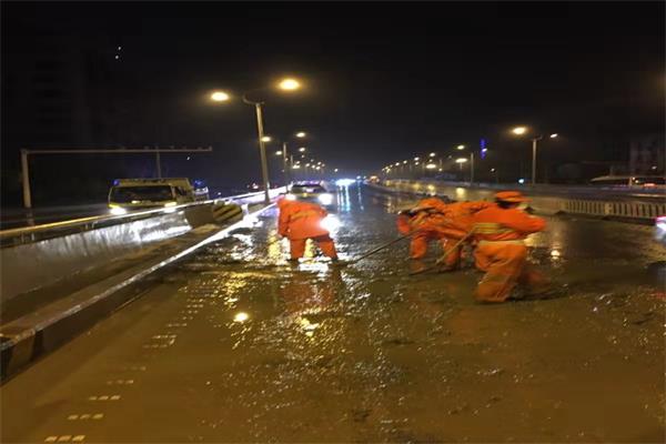 工作人员在30分钟内到达指定地点,首先集中力量突击清理出一股抛洒物较少的车道,以通保证车辆通行,再逐条道路进行清理。现场组织有序、分工明确、忙而不乱,清理、转运、冲洗等工序流水作业一气呵成。经过近5个小时的连续奋战,终于在上午9点钟将污染物全部清洗干净,恢复了桥面交通,保障市民出行畅通。
