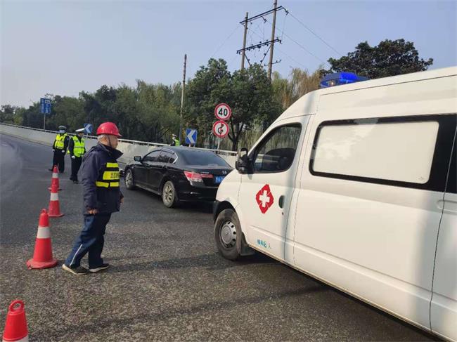 9点30分,江城气温较低,天气比较寒冷,长江二桥杨园匝道发生了一起交通事故,一个骑摩托车的车主不慎重重地摔倒在道路上。险情就是命令,当班管护队员火速赶到现场,协助交警在事故现场摆放反光筒,维持现场秩序,把伤者合力抬上救护车,为抢救生命营造通道。随后及时清理事故现场遗落的杂物,检查事故现场桥梁设施毁损情况,以高度负责的精神保障桥梁安全畅通。