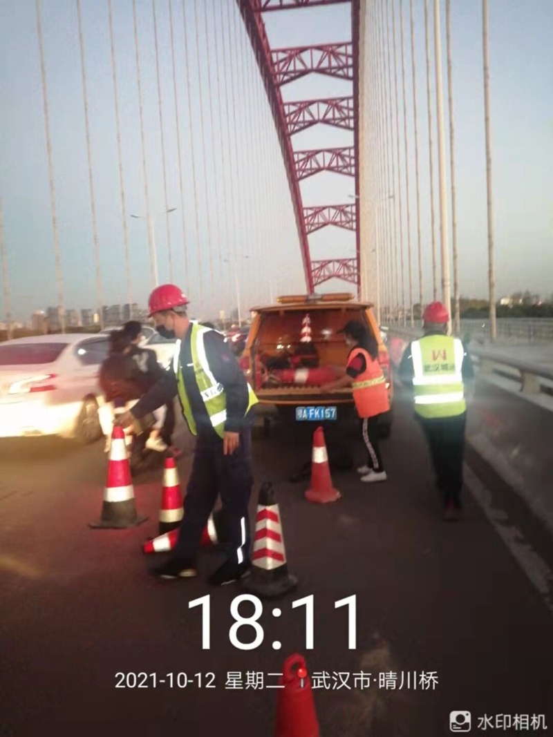 汉江一所管护队员在接到通知后,及时赶赴漏撒现场。17:35分保洁单位和管护队员到达现场后发现漏撒物的确是玻璃渣,漏撒距离约百余米,并且占据了整个车道。此时晴川桥上车流量越来越大,车速也较快,两位当班管护队员分工协作,一名队员在桥面指挥车辆绕道行驶,一名队员驾驶巡查车辆将反光锥等安全设施运至事发地,在漏撒区域快速摆放好反光锥协助保洁人员及时进行清扫工作。18:19桥面漏洒物清扫完毕,晴川桥车辆恢复正常通行。