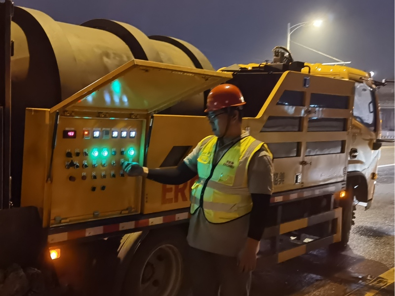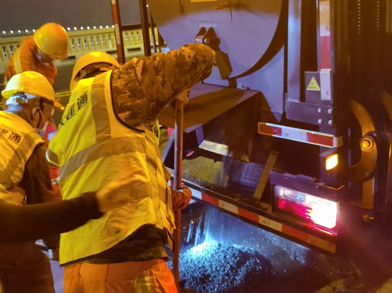 2022年5月19日夜间,建通公司首次将安全防护车、路面综合养护车投入长江大桥铺装层维修施工。其中,安全防护车能极大降低道路施工交通安全风险,路面综合养护车则集切缝、凿除、清底、撒布、沥青混凝土制拌与碾压于一体。相较传统作业方式,“双车联动”不仅能够有效提升安全防护功效,还能在确保质量的基础上显著提高施工效率。