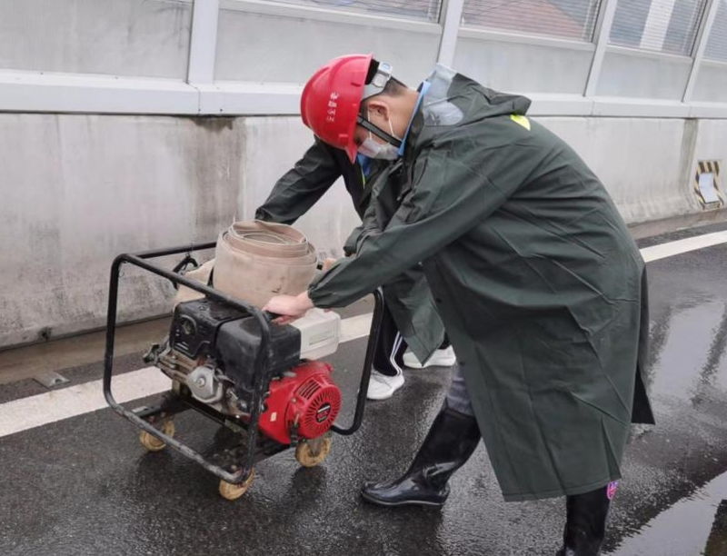 此次防汛排渍演练在仙女山路一号桥桥面、江汉六桥汉阳岸接线工程高架两处同时展开。运维人员在进行日常巡查时发现,仙女山路一号桥和江汉六桥汉阳岸接线工程高架桥桥面均有大量积水,影响行车安全。经开分公司立即启动防汛排渍预案,组织人员携带工具赶赴现场,按照安全作业标准迅速开展大量积水抽排工作。经过30分钟奋战,桥面积水抽排完毕,险情排除。随后,洒水车对积水处地面污渍进行冲洗,恢复原貌。