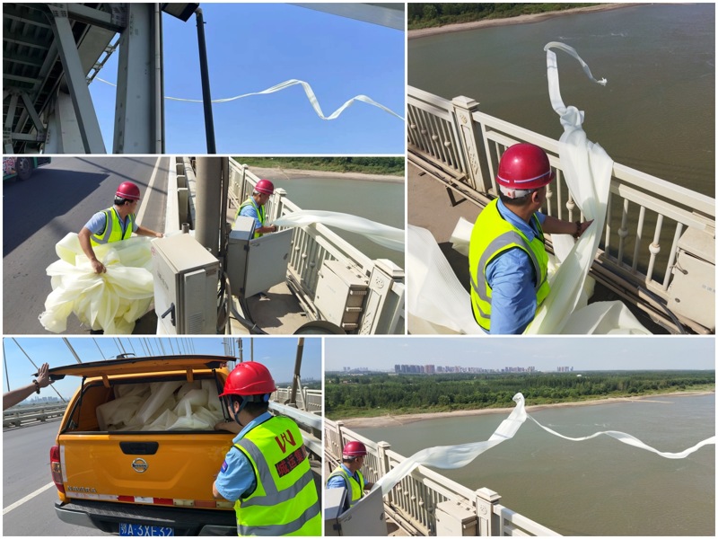 8月17日下午14:40分,桥梁运维分公司所属天兴洲运维所接到武汉铁路生产车间电话,告知桥面钢梁区域内有一大型异物飘浮空中,影响铁路行车安全。接报后,运维所3位同志立即出发赶至现场,发现异物为宽1米、长40米左右的塑料隔膜,一头缠绕在天兴洲大桥斜拉索底部,其余部分飘浮在江面。