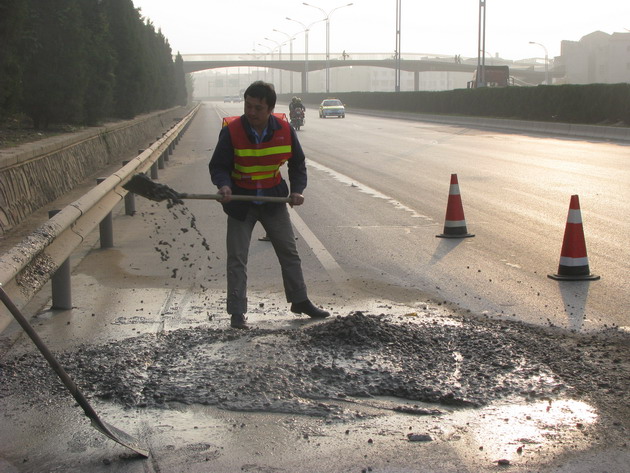 5月6日清晨6时,长丰桥管理所管护一队在巡检至三环线北段外环283#杆附近时,发现该路段有近20多平方的混凝土抛洒,并侵占了一股行车道,严重影响过往车辆行车安全。由于该混凝土刚漏洒下来还是湿的,为避免混凝土凝固后更难处理,他们顾不上通知保洁单位,立即将该处用反光锥打围,拿起铁揪立刻进行清理。经过1个多小时的奋战,抛洒的混凝土终于清扫完毕,确保了三环线高峰时段行车畅通。