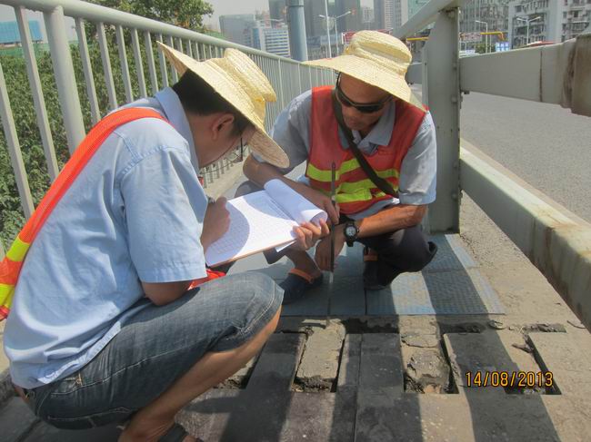 上午9时,3名管护队员身着工作服、反光背心、头戴草帽、携带直尺、记号笔、检查记录表格等检查工具整装待发。来到桥面,虽然火辣辣的太阳烤得大家汗流满面,但丝毫没有影响大家的工作热情,队员们分工合作,1人测量、1人记录、另1人协助交通疏导,他们认真地检查桥面伸缩缝是否堵塞卡死、连接部件有无松动、脱落、局部破损等现象。经过近2个多小时的检查,全面掌握了月湖桥全桥22条伸缩缝,在高温天气下的运行状况,为桥梁标准化管养提供了科学依据。
