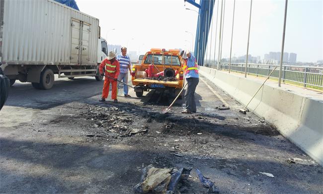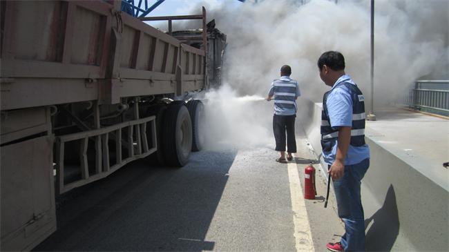 时值武汉酷夏,车辆自燃事件频发。7月29日13时10分,路桥中心长丰桥管理所通过监控视频发现,长丰桥汉阳往汉口方向桥面中间,一辆大型平板挂车自燃着火。发现险情后,长丰所立即启动《桥梁突发事件应急预案》,拨打电话120和119报警。与此同时,管护人员携带灭火器赶往现场,用反光锥对事故现场进行隔离,疏导交通,用灭火器对车辆着火部位进行灭火。由于车辆整个驾驶室起火燃烧,火势较大,灭火器只能控制火势。13:40分,消防队赶到现场,将火扑灭。事故车辆被拖走后,管理所立即对事故现场进行清扫冲洗,对桥梁设施受损情况进行检查,通知技术人员对烟熏的吊杆进行了检测。14:30分,长丰桥桥面交通全面恢复正常。