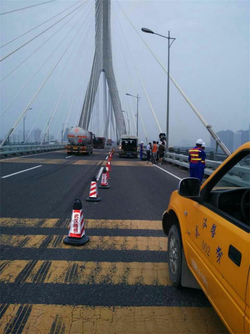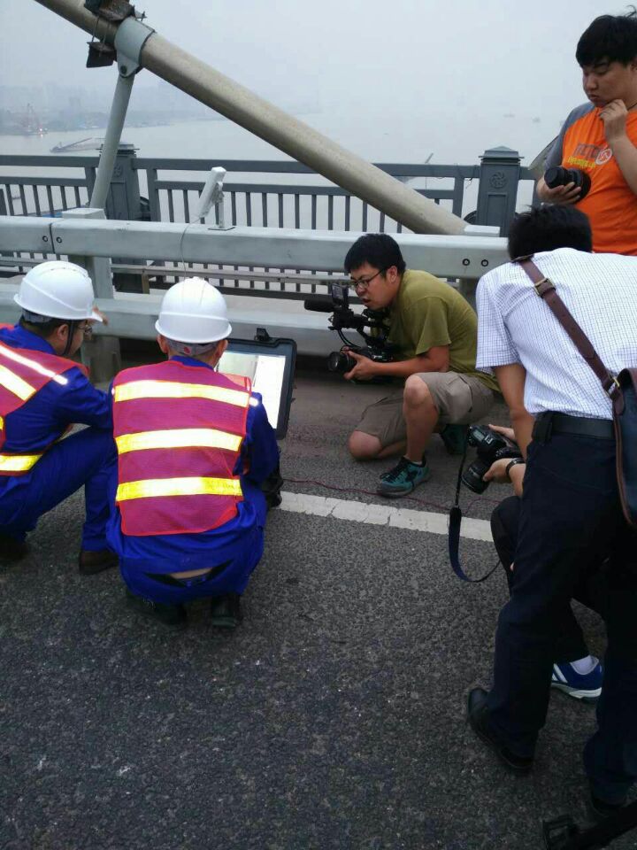 2016年6月7日晚17:00时至19:00时,中铁大桥局桥科院组织科研人员运用新型智能斜拉索检测仪--探索者,在天兴洲长江大桥进行了现场检测实验,吸引了中央电视台科技频道记者到现场进行了采访报道。天兴洲大桥管理所积极配合,启动相关预案,经过精心组织,认真部署,对检测区域进行了道路封闭和警示布置。