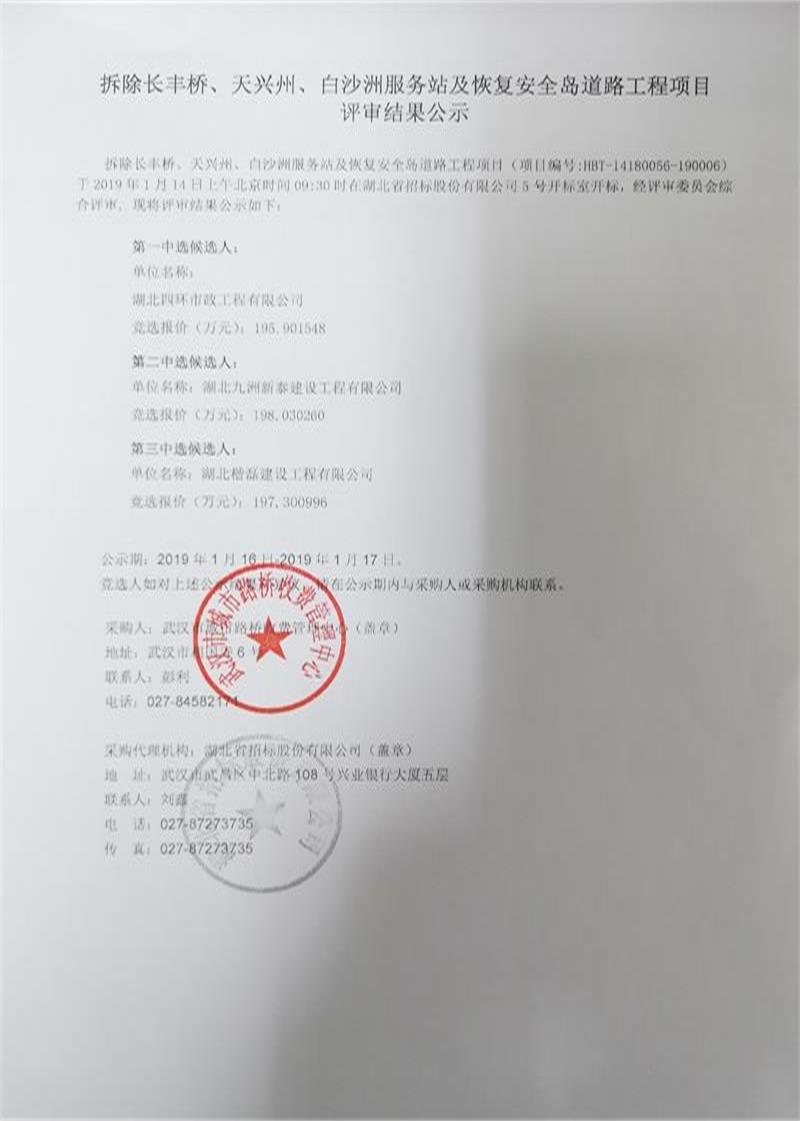 拆除长丰桥、天兴洲、白沙洲服务站及恢复安全岛道路工程项目评审结果的公示