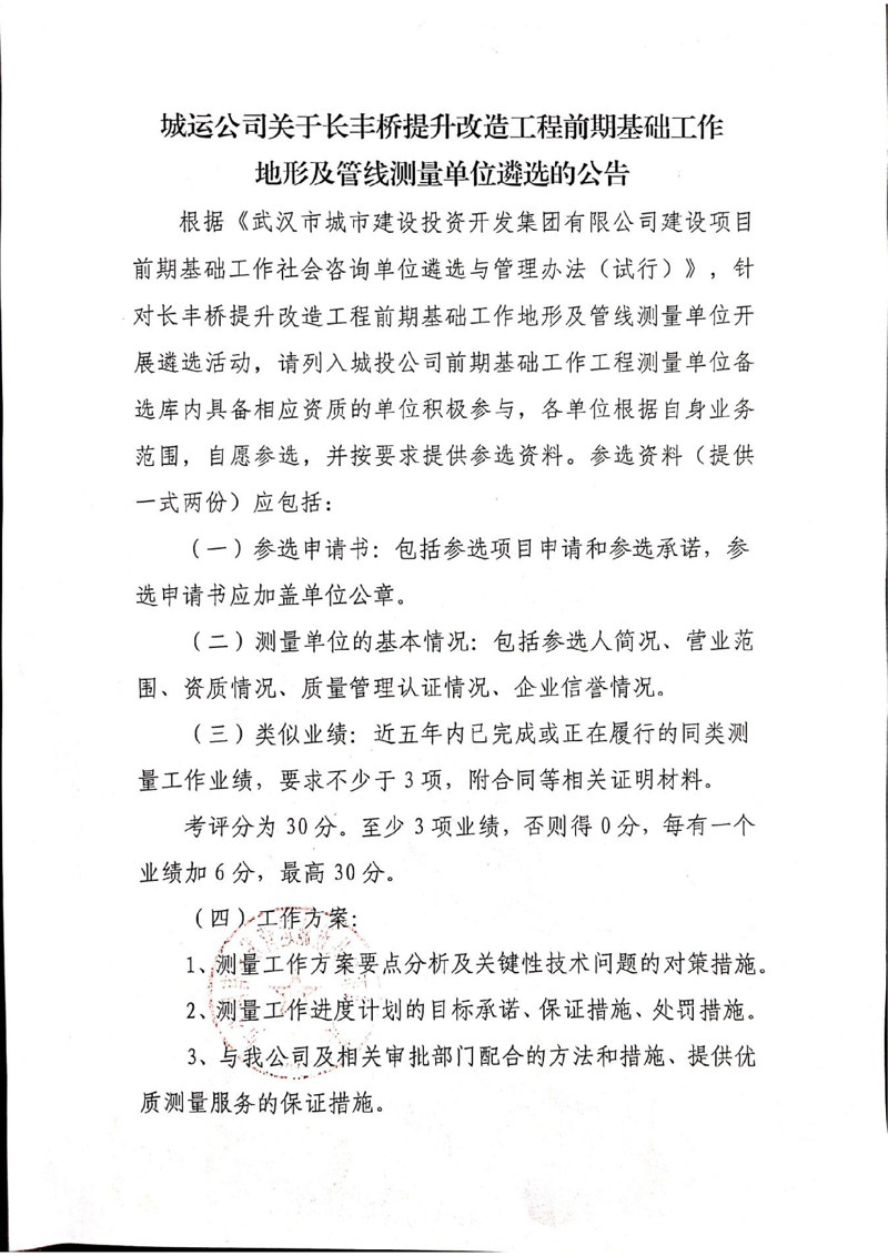 城运公司关于长丰桥提升改造工程前期基础工作地形及管线测量单位遴选的公告