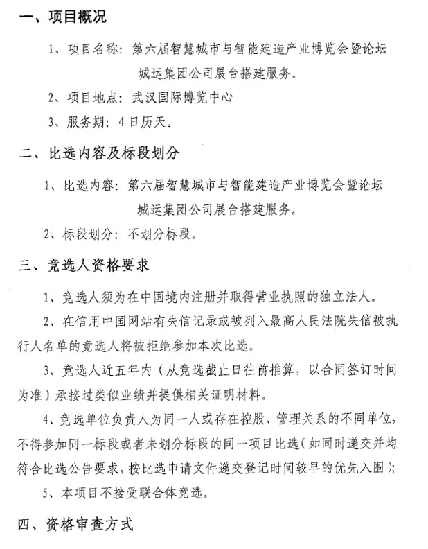 第六届智慧城市与智能建造产业博览会暨论坛城运集团公司展台搭建服务中选结果的公示