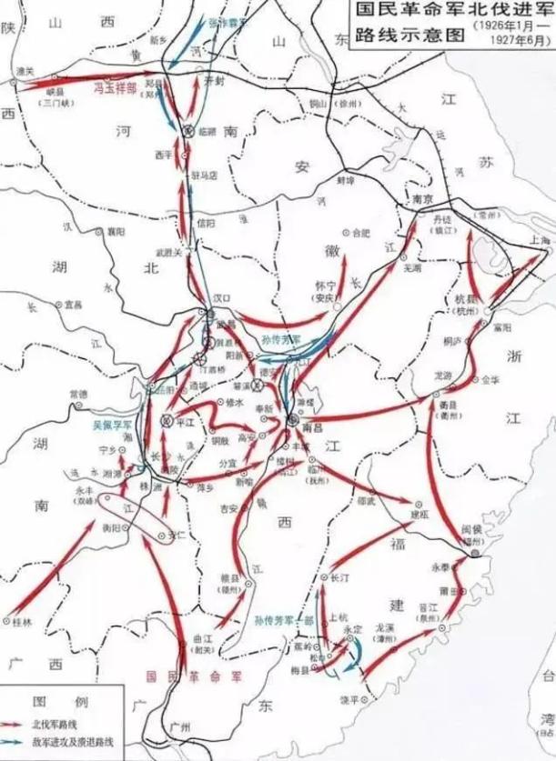 国民革命军在以加伦为首的苏联军事顾问的建议下,制定了集中兵、各个歼敌的战略方针:首先向湖南、湖北进军,长驱直进,迅速消灭北洋军阀中最薄弱的一环——吴佩孚部的主力,争取张作霖、孙传芳两部在一段时间内保持中立;待两湖战场取得胜利后,再引兵东向,消灭孙传芳部;最后,北上解决实力最为雄厚的张作霖部。这个战略方针是正确的。